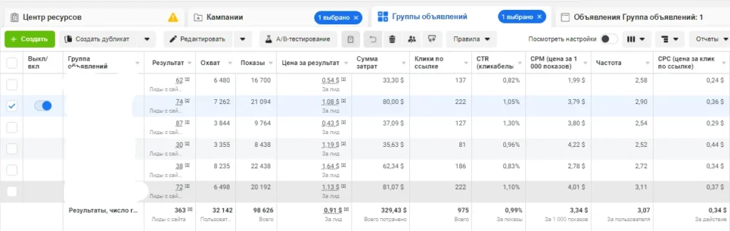 На скрине — сводная статистика по группам объявлений: объём лидов, охват/показы и стоимость результата, подтверждающая итоговые KPI проекта.